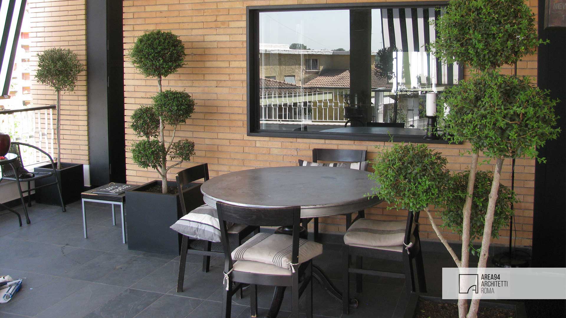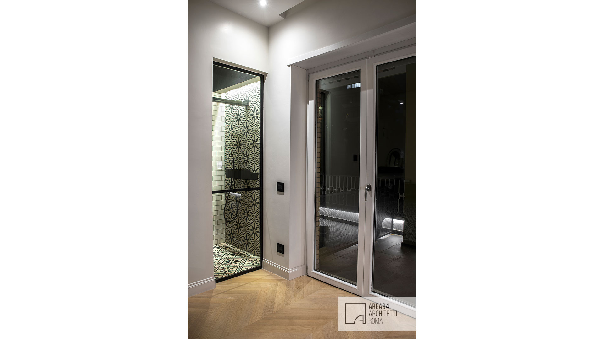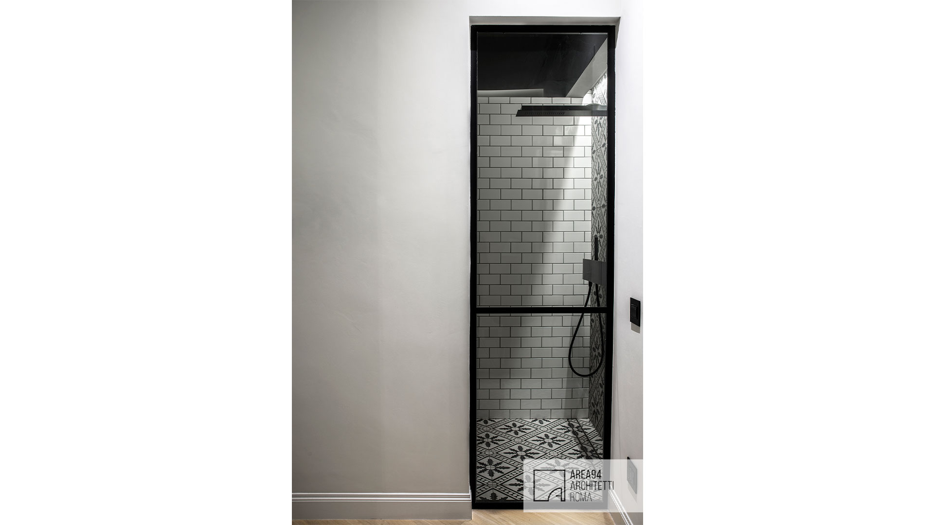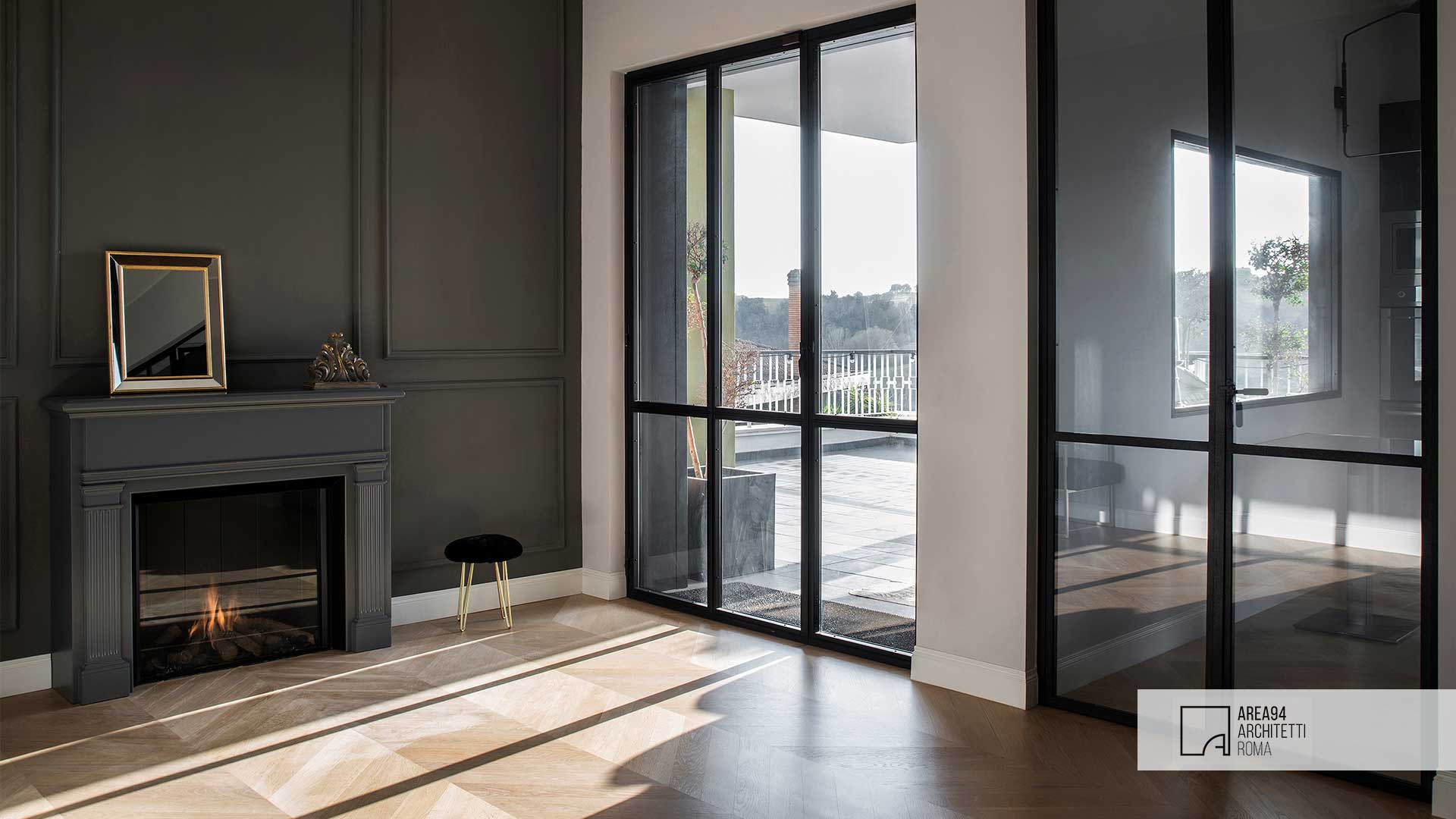 Lo scopo dell’intervento di ristrutturazione è stato quello di creare degli spazi proporzionati e trovare posto anche per un secondo bagno. Attraverso l’uso di grandi vetrate in ferro-finestra dal gusto retrò, i vari ambienti sono stati messi in comunicazione spaziale e visiva tra di loro e con il terrazzo, grande protagonista dell’attico che gode di una vista privilegiata sul parco dell’Insugherata.