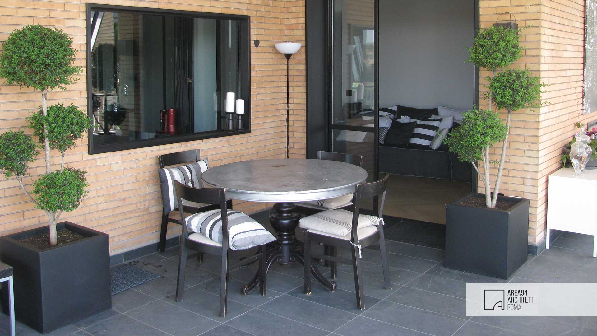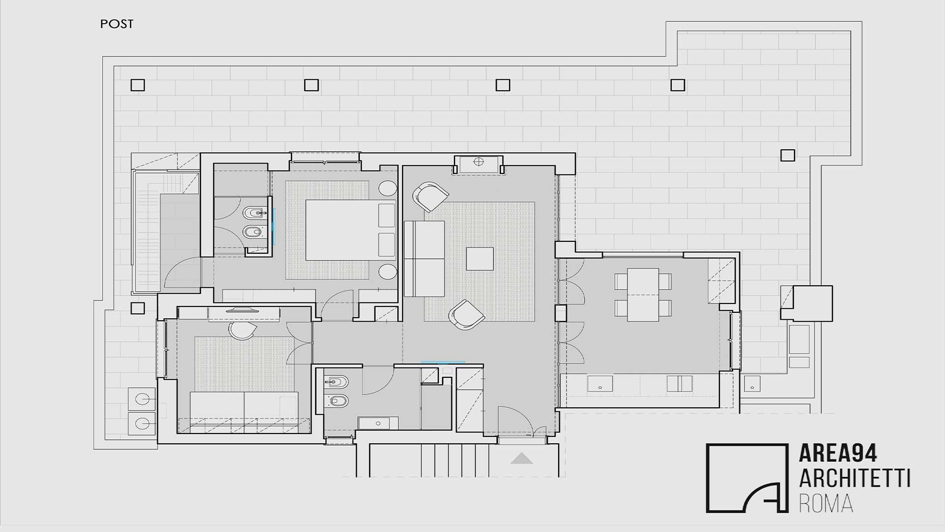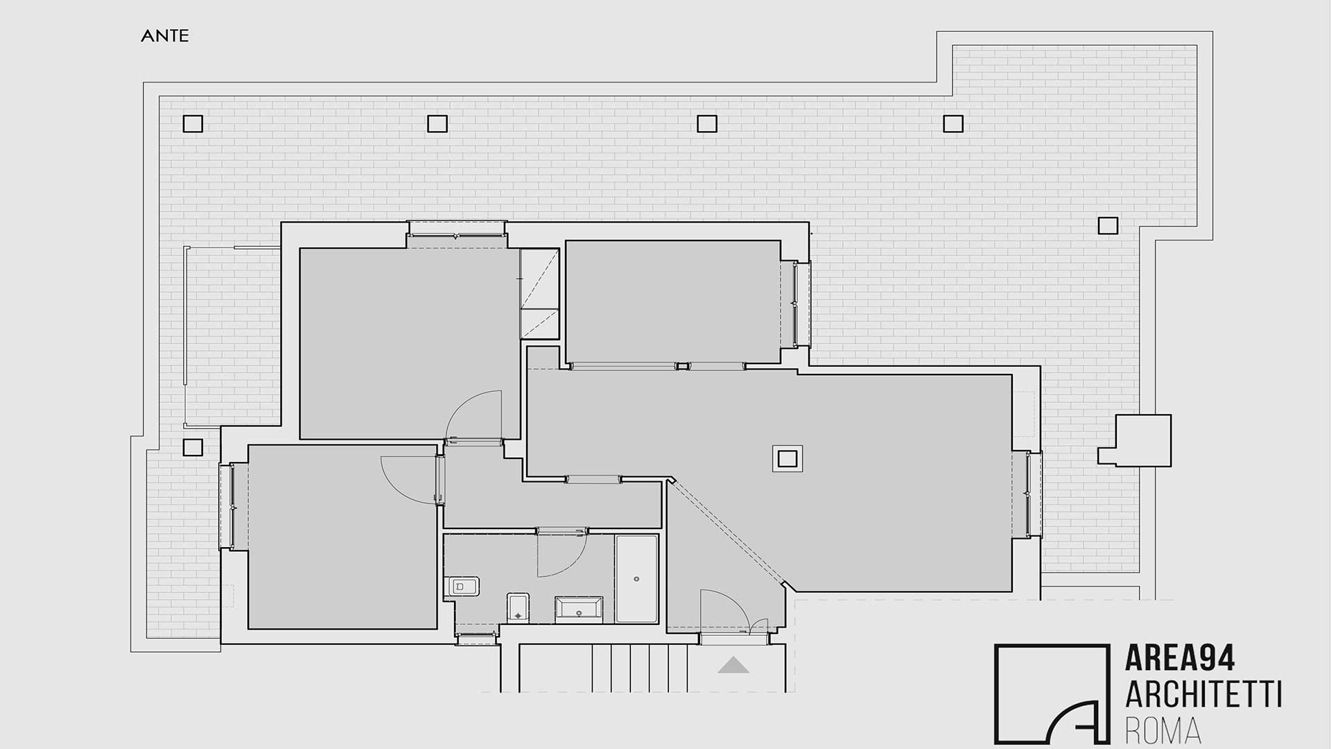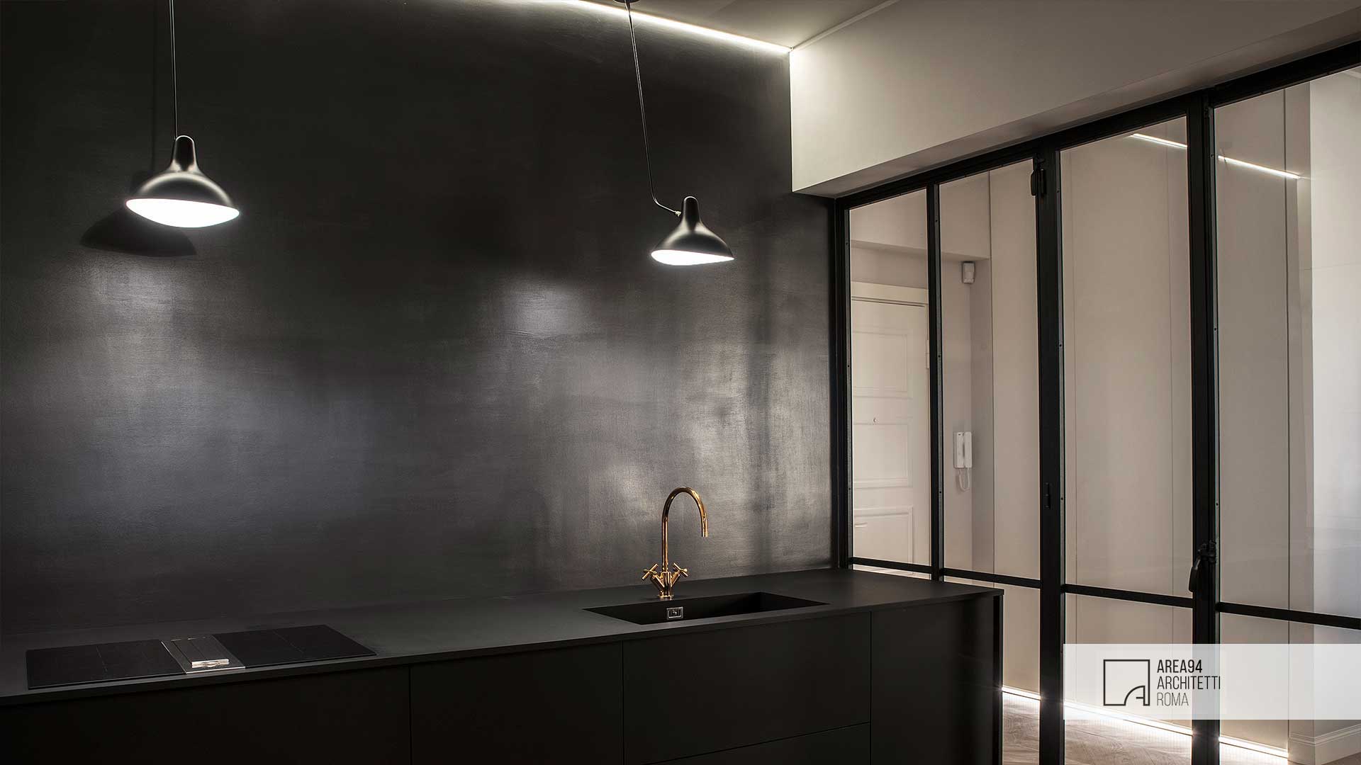Lo scopo dell’intervento di ristrutturazione è stato quello di creare degli spazi proporzionati e trovare posto anche per un secondo bagno. Attraverso l’uso di grandi vetrate in ferro-finestra dal gusto retrò, i vari ambienti sono stati messi in comunicazione spaziale e visiva tra di loro e con il terrazzo, grande protagonista dell’attico che gode di una vista privilegiata sul parco dell’Insugherata.