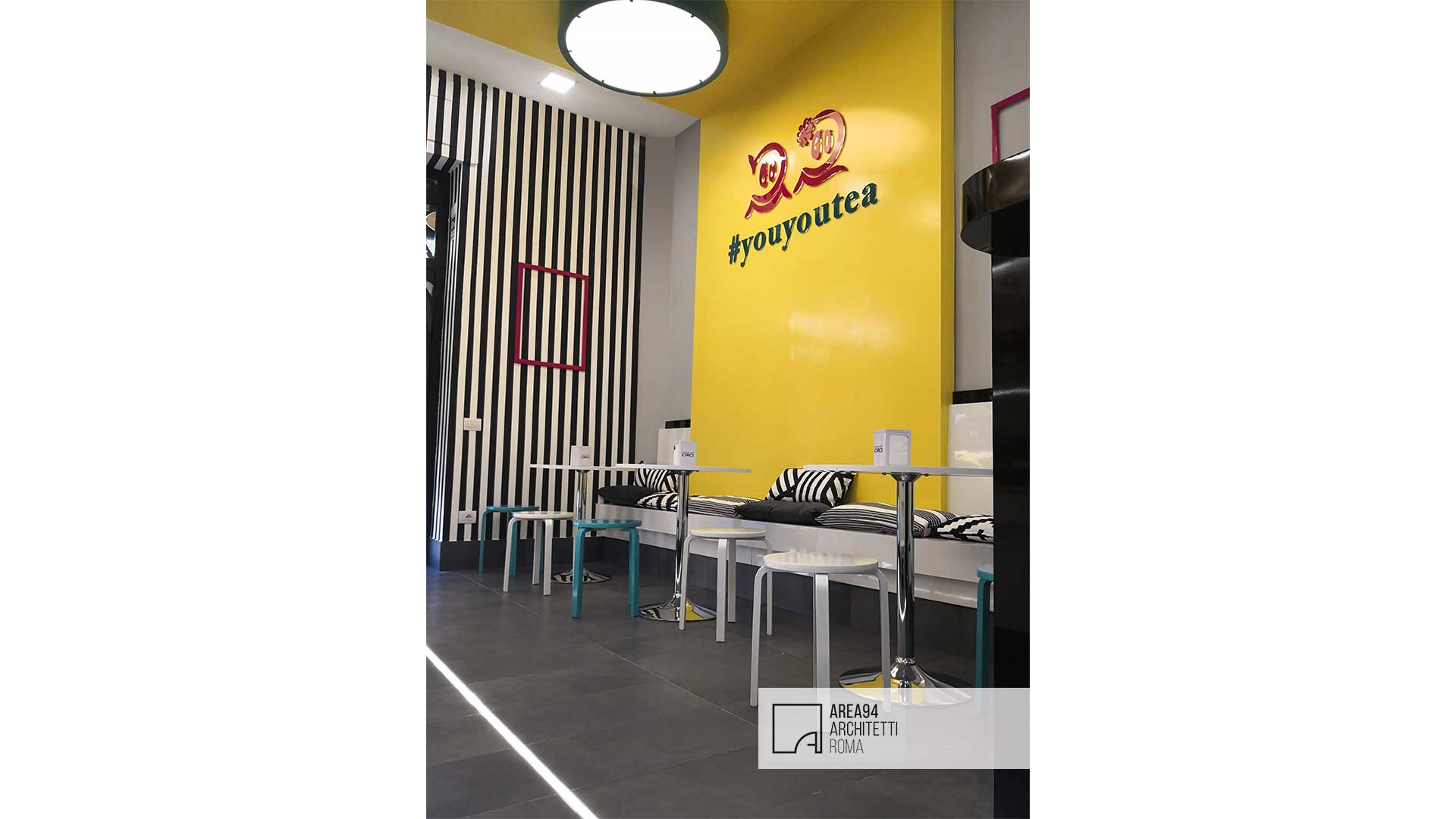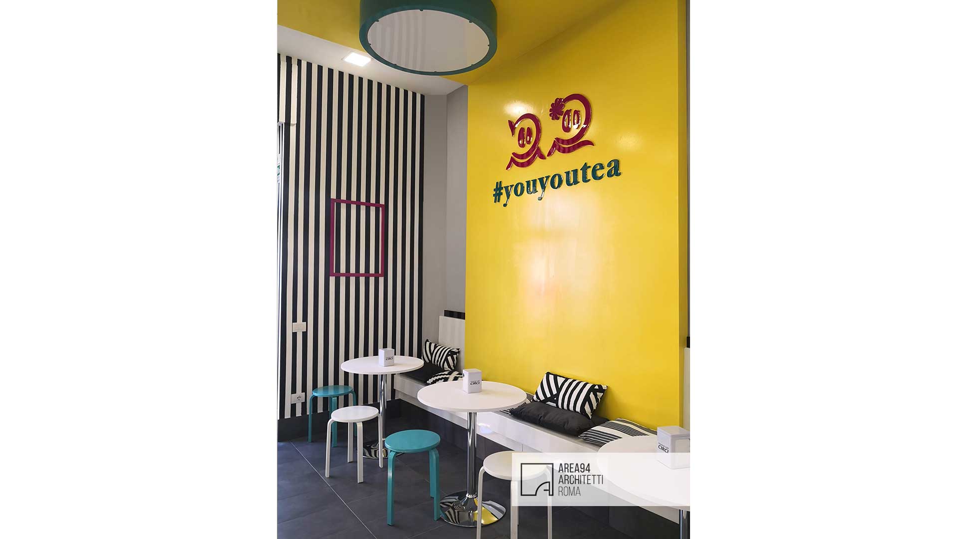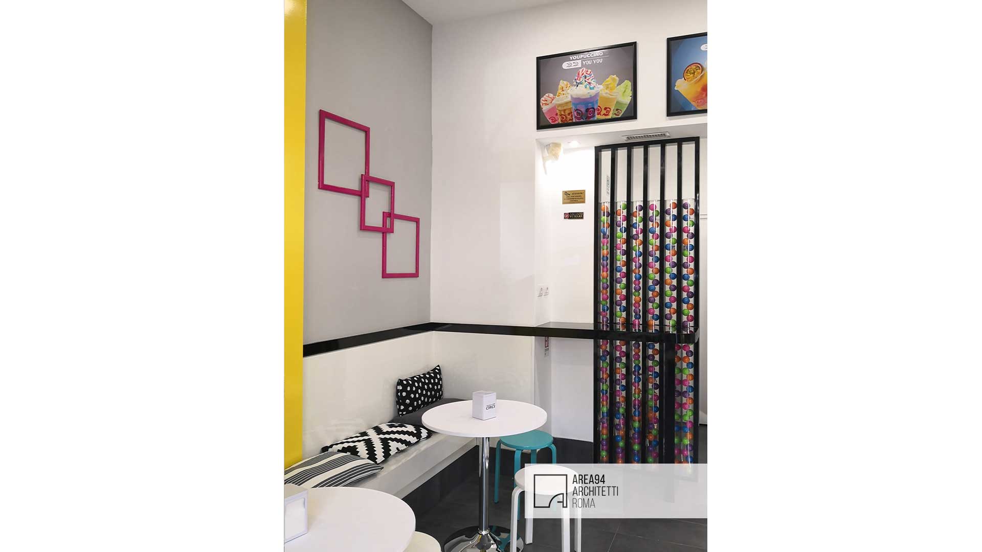 Ristrutturazione totale di un piccolo locale commerciale sito in zona San Giovanni a Roma. La richiesta del committente era quella di creare uno spazio moderno e vivace , adatto alla fruizione di un pubblico giovane e giovanissimo, attraverso lo studio di un branding accattivante. Il pochissimo spazio a disposizione ha reso indispensabile creare un’area bar che potesse contenere il materiale necessario sfruttando per intero l’altezza dell’unica parete a disposizione; La piccola zona restante per la somministrazione è stata progettata e realizzata su misura al fine di poter ospitare un maggior numero di clienti. Elemento architettonico e protagonista dello spazio è un “nastro giallo” che da seduta per i clienti si trasforma in soffitto e poi in struttura portabottiglie per il retro banco del bar, fungendo anche da fondale con tanto di hashtag per le foto social da condividere in rete. I grandi corpi illuminanti colorati, progettati e realizzati su misura, contribuiscono a movimentare la superficie dei soffitti. Lo stile creato rievoca una ambientazione pop, ricca di dettagli colorati in organica connessione tra loro.