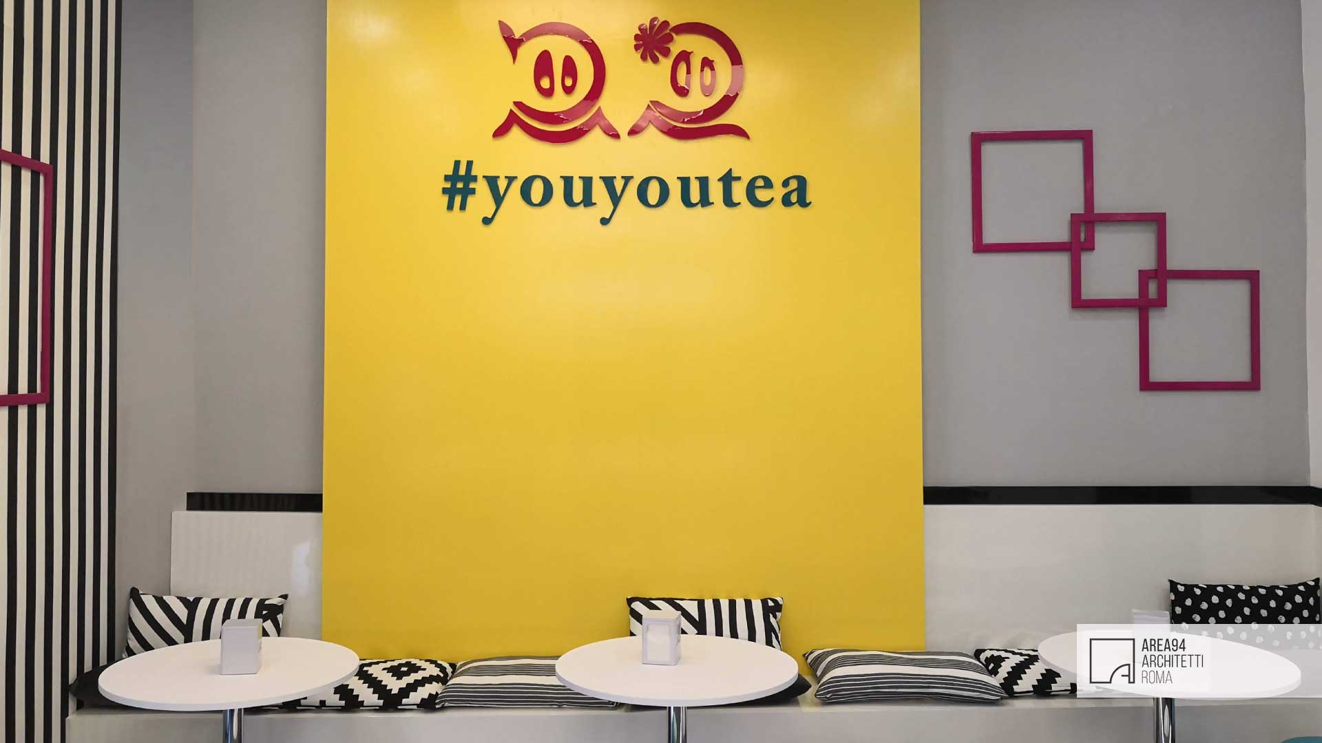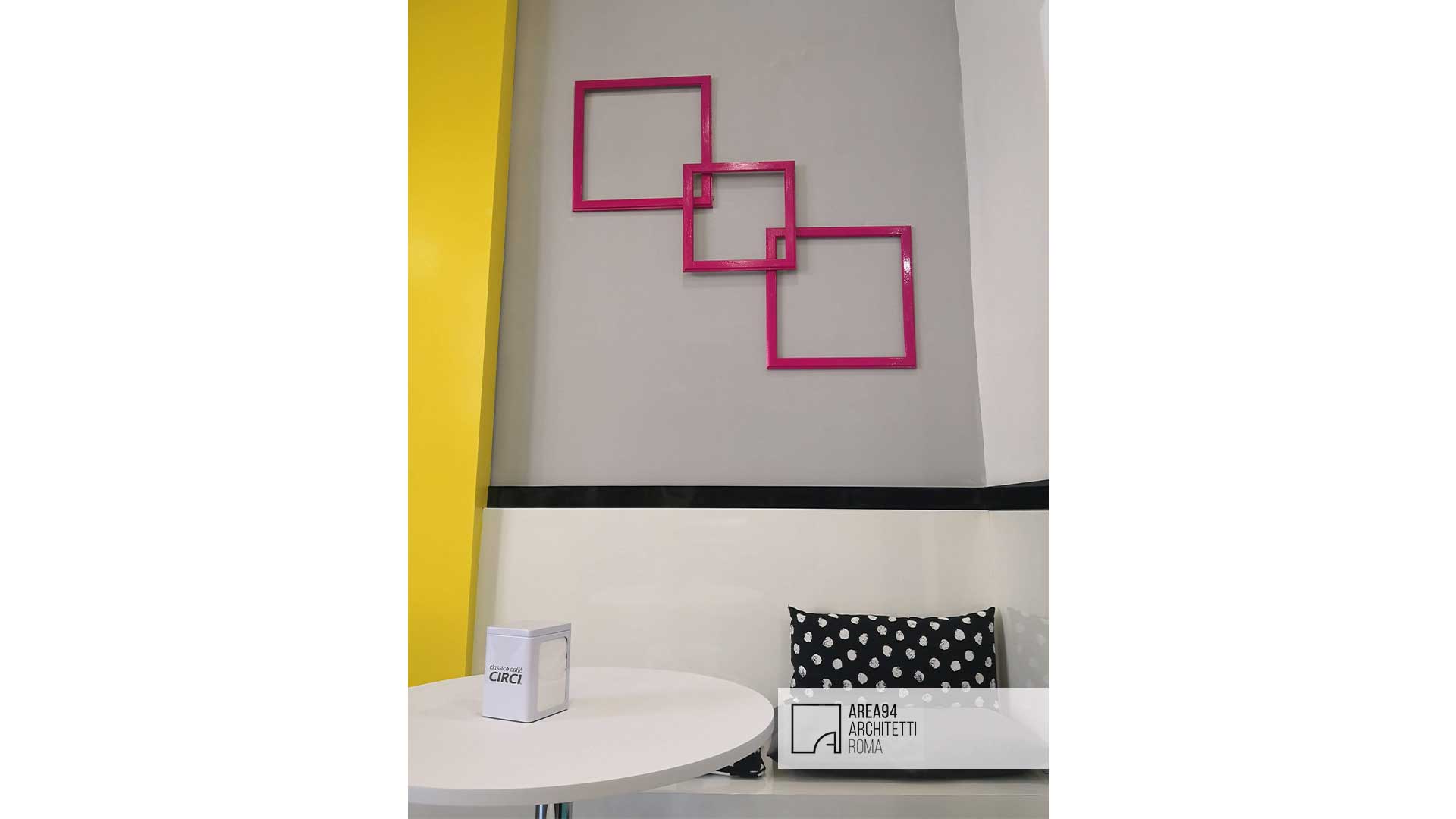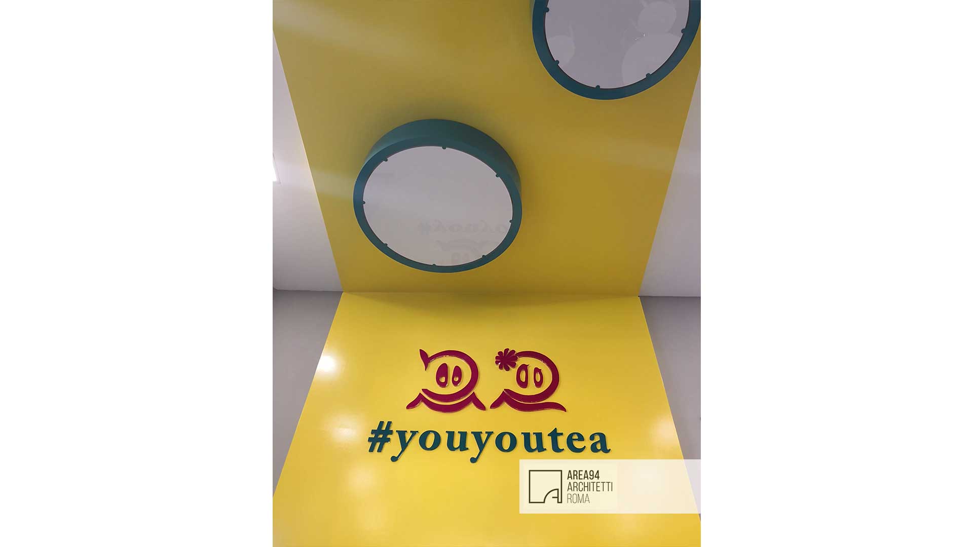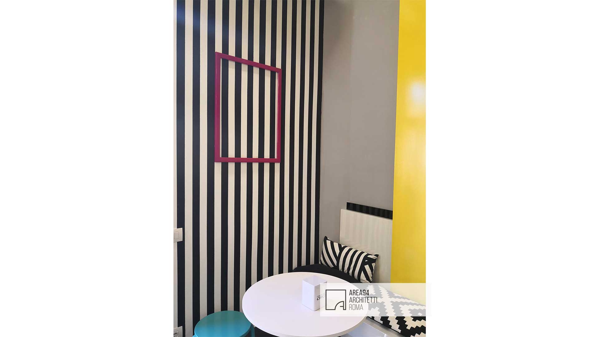 Ristrutturazione totale di un piccolo locale commerciale sito in zona San Giovanni a Roma. La richiesta del committente era quella di creare uno spazio moderno e vivace , adatto alla fruizione di un pubblico giovane e giovanissimo, attraverso lo studio di un branding accattivante. Il pochissimo spazio a disposizione ha reso indispensabile creare un’area bar che potesse contenere il materiale necessario sfruttando per intero l’altezza dell’unica parete a disposizione; La piccola zona restante per la somministrazione è stata progettata e realizzata su misura al fine di poter ospitare un maggior numero di clienti. Elemento architettonico e protagonista dello spazio è un “nastro giallo” che da seduta per i clienti si trasforma in soffitto e poi in struttura portabottiglie per il retro banco del bar, fungendo anche da fondale con tanto di hashtag per le foto social da condividere in rete. I grandi corpi illuminanti colorati, progettati e realizzati su misura, contribuiscono a movimentare la superficie dei soffitti. Lo stile creato rievoca una ambientazione pop, ricca di dettagli colorati in organica connessione tra loro.